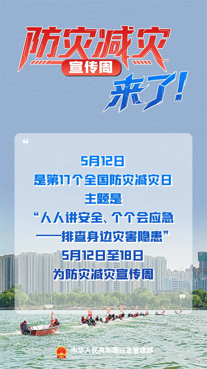 今天(5月12日),是第17個全國防災減災日,主題是“人人講安全、個個會應急——排查身邊災害隱患”,5月12日至18日,為防災減災宣傳周。